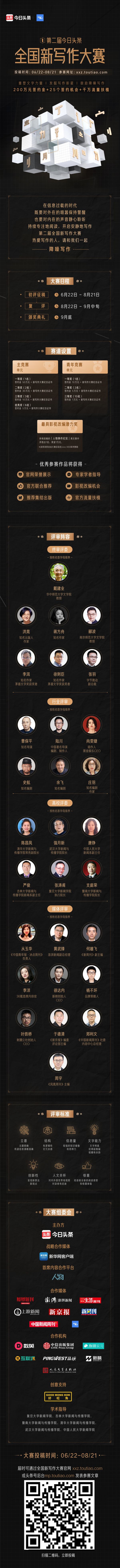 2020年,今日头条集结20多家媒体、高校和合作品牌,共同发起第二届今日头条全国新写作大赛。提供25个签约机会和200万签约金,鼓励全国写作爱好者踊跃投稿。2020年6月22日,大赛正式开启,你可以通过大赛官网(xxz.toutiao.com)或头条号后台(mp.toutiao.com)发表参赛作品。