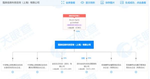 天眼查数据显示,蔻森信息实际控制人系注册于香港的Acorn Spring Limited。旗下控制不少带有“安创”字样的投资机构,这些机构不同程度参与了企业融资活动。巧合的是,安创也是ARM旗下正统机构,很容易让人产生“同属一家”的错觉。