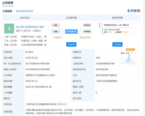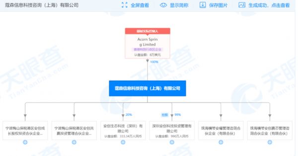 天眼查数据显示,蔻森信息实际控制人系注册于香港的Acorn Spring Limited。旗下控制不少带有“安创”字样的投资机构,这些机构不同程度参与了企业融资活动。巧合的是,安创也是ARM旗下正统机构,很容易让人产生“同属一家”的错觉。