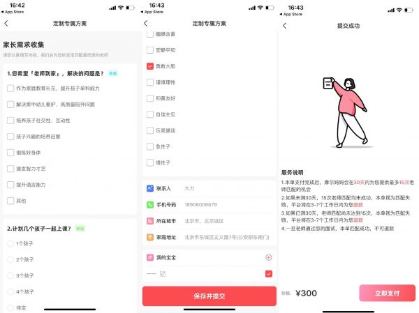 对发出需求单的家长用户,摩尔妈妈平台每单收取300元的匹配服务费。具体规则为,30天内平台为家长提供最多15次老师匹配机会,一旦老师通过家长的面试,即视为匹配成功,不可退款。但如果30天内,平台匹配了15次老师均未成功,或者已满30天,匹配老师尚未达到15次,都视为本单匹配失败,平台将在3-7个工作日内,为家长用户退款。
