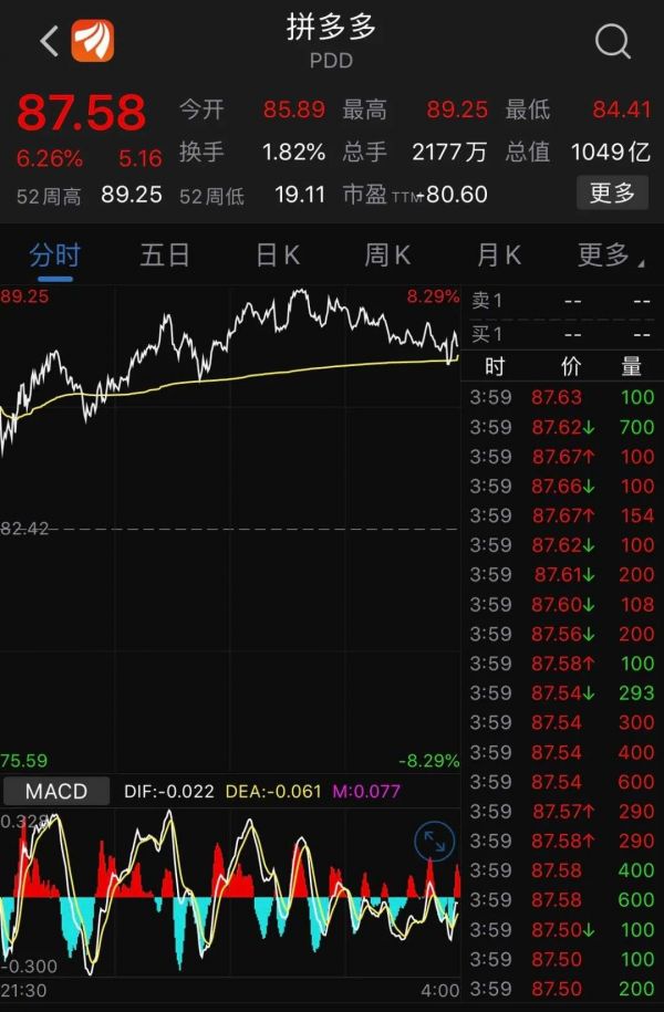 进入6月,拼多多股价继续走高,堪称电商界最强后浪。数据显示,美股最后一个交易日,拼多多股价大涨6.3%再创新高为87.58美元,市值突破千亿美元达到1049亿美元。由此来看,从4月初至今,拼多多股价上涨约143%。而同一时间段,腾讯、阿里巴巴股价分别上涨21%和19%。