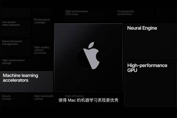 再比如机器学习加速器、神经引擎和高性能GPU的搭配使用,使得Mac的机器学习加速效果更优秀。
