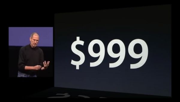 “如果你去了解那些业内人士的推测,你可能会发现,他们认为我们会把这款iPad产品定价控制在1000美元以下。通常,这就意味着这款产品售价可能是999美元。”乔布斯说。当他说完这句话过后,乔布斯身后的大屏幕上,就出现了999美元这几个字符,而且还是加粗的字体。