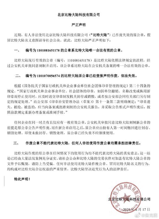 6月20日,詹克团通过个人weibo再次发布声明称,比特大陆北京公司原来的旧公章已失效,编号为1101070056574的新公章是唯一合法有效的公章。该公章是詹克团将北京比特大陆科技有限公司(以下简称北京比特)的法定代表人变更为自己后,重刻的新公章。