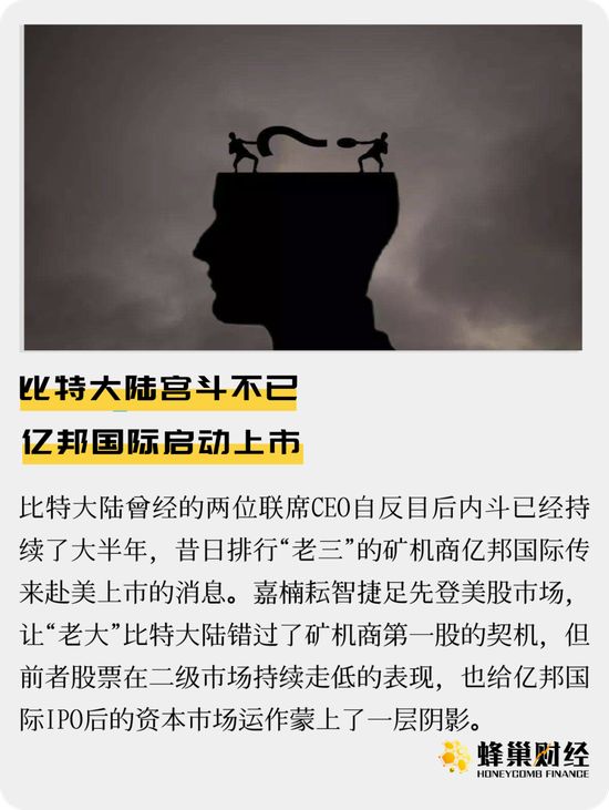 深陷内斗泥潭的比特大陆,此时显然无暇资本运作。与此同时,生产矿机的同行亿邦国际在近期传来将赴纳斯达克上市的消息,时间都定在了6月26日。