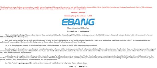 据亿邦国际6月17日递交的最新版招股书显示,该公司拟发行1932.36万股,发行价区间为4.5美元到6.5美元,拟募资金额为8695万美元到1.25亿美元,若承销商行使选择权全额购买额外的A类普通股,则最高发行总量达2222.214万股,由此计算,最高可募资1.44亿美元。