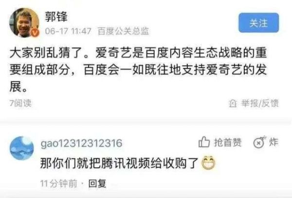 面对多家媒体的求证,腾讯、爱奇艺、百度三方均表示“不予置评”。在百度App上实名认证为“百度公关总监”的郭锋回应:“大家别乱猜了。爱奇艺是百度内容生态战略的重要组成部分,百度会一如既往地支持爱奇艺的发展。”
