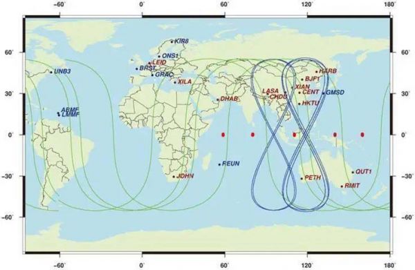 北斗卫星轨迹在地面投影:蓝色8字形轨迹为IGSO卫星,红色定点为GEO卫星,绿色为MEO卫星(未全部展示所有卫星,图源:doi.org/10.1038/srep04692)