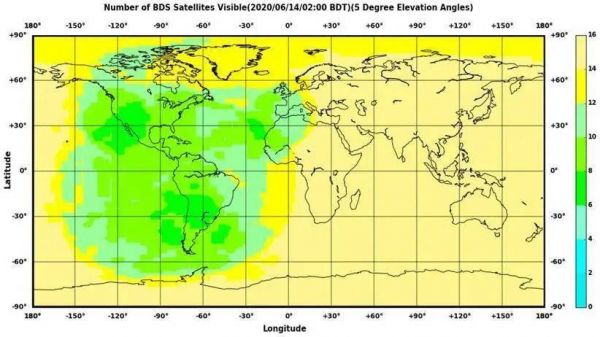 2020年6月14日全球可以看见的北斗卫星数量分布图,可以看出能实现全球定位(>3),且亚太地区数量更大、定位精度更高(图源:北斗办)