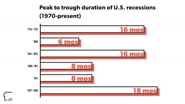 First Round创始合伙人Josh Kopelman表示: “现在30多岁的创始人在大萧条时期可能还在读大学,从那之后,一切又开始复苏,开始向好。因此,我要做的第一件事就是要确保让这些创始人认识到他们现在所处的环境与过去不同。虽然经济衰退可能很快就会恢复,但我认为评估这种情况再次发生的可能性仍然非常重要。如果你观察过过去五十年间大规模的经济衰退相关信息,你会发现平均持续时间是12个月。这还不包括后续开始恢复的时间,只是从发生到触底的时间。当然,有可能实现快速地复苏,但同时长期的衰退甚至更加严重的经济危机也同样有可能。因此,了解你们公司可能需要面临的生存环境十分重要,不要掩耳盗铃。”