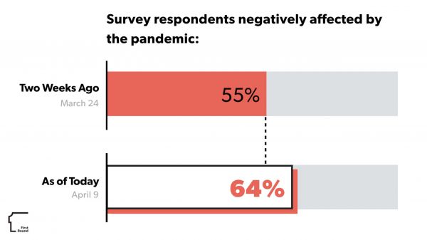 为了更具体的表现这种影响的变化速度有多快,我们尝试对创始人计划如何度过这场危机展开了一项倾向调查。仅仅两个周的时间内,我们发现报告受到新冠肺炎病毒负面影响的受访者比例就从三月底的55%上升到了四月初的64%。