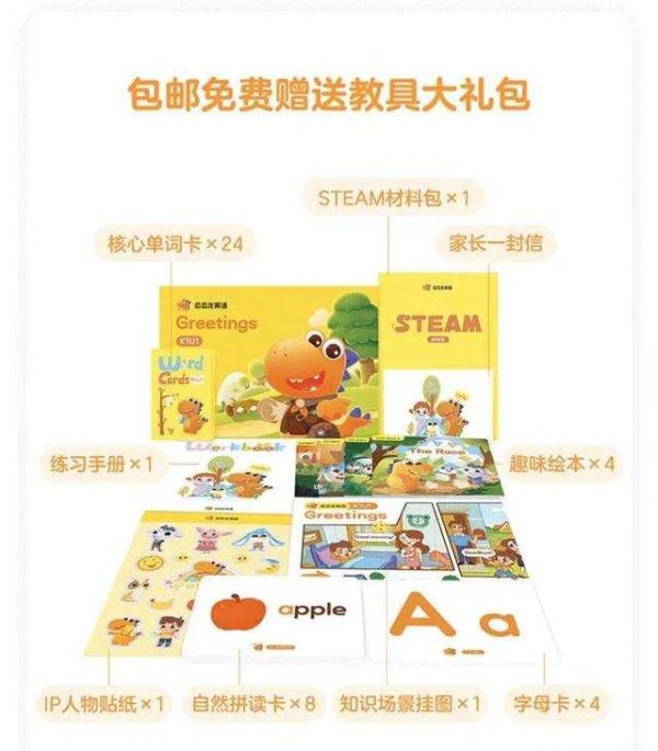 瓜瓜龙英语采用AI在线互动课程+助教微信群辅导+线下教材学习相结合的教学形式。用户购买课程后,除了在App中解锁每日课程内容,还会通过微信对接指导老师,加入班级群。用户还可收到一份瓜瓜龙寄出的教材,包括瓜瓜龙自编的绘本、练习册、单词卡。