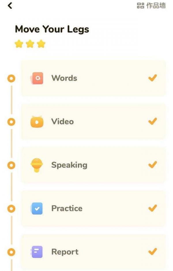 具体体验上,每日7点App内解锁当日课程。每日课程采用固定的4大学习环节,学习完一个环节后系统自动解锁下一个环节。系统首先解锁当日单词卡,由AI朗读当日所学单词,学生识记并跟读。随后观看当日五分钟左右的课程视频,课程形式是产品IP动画形象瓜瓜龙与外教共同出演的动画片。
