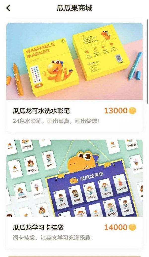 瓜瓜龙还设置了多种游戏化的成长与比拼机制。App内设置了一整套金币与勋章兑换系统。薛元如果按时完成课程,练习环节中达到高正确率,可以兑换App内的虚拟货币“瓜瓜果”,累积瓜瓜果可以于瓜瓜龙商城中兑换水彩笔、收纳箱等物品。
