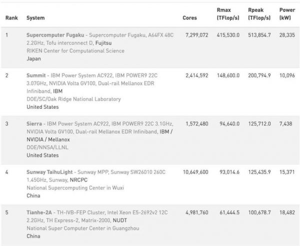 富岳系统登顶后,美国超算Summit和Sierra屈居二、三位,曾经4连榜首和6连榜首的中国超算“神威·太湖之光”和“天河二号”,在本次榜单中排名四、五位。