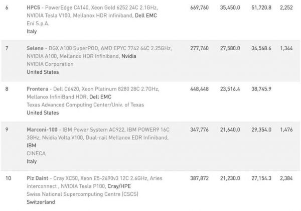 榜单的前10位中,还有3台“新势力”:排名第6的HPC5,由意大利能源巨头Eni出资研制;排名第7的Selene,由英伟达首次推出,搭载了AMD EPYC处理器+最新的A100GPU;排名第9的Marconi-100,部署在意大利计算中心。