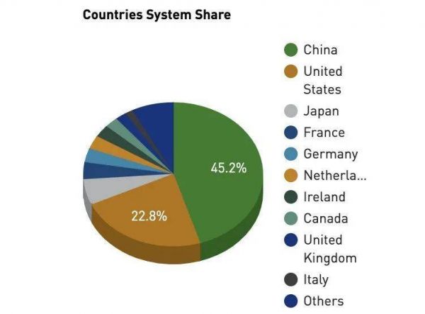 在TOP500的国家份额上,中国大陆上榜226台系统(台湾地区超算未计入此数字),占总上榜数的45.2%;其次是美国,114台;日本排在第三位,上榜30台。