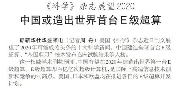 今年初,《科学》展望2020,称中国或造出世界首台E级超算