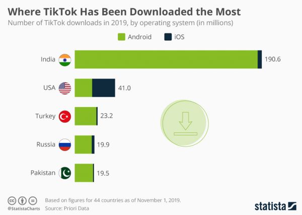 Priori Data提供的2019年11月的数据显示,印度仍然遥遥领先,下载量达到1.906亿。美国位居第二,实现了4100万次TikTok下载。