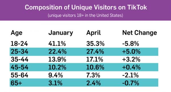 疫情期间,被隔离的美国人休闲时间增多,这给TikTok带来了增长的好机会。据Comscore称,年龄在25岁至34岁之间的用户,占总用户比例从22.4%增加到27.4%,而35-44岁之间的用户比例从13.9%增加到17.1%。今年1至4月,TikTok独立访问用户从900万增长到了近1400万。