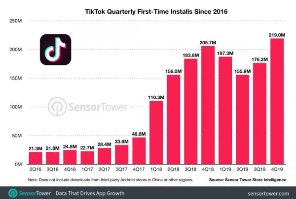 TikTok在美国的受欢迎程度跟全世界是同步的。据Sensor Tower的数据显示,2019年第四季度被下载了2.19亿次。截至2019年底,TikTok总计下载了16.5亿次下载。2019年的下载量占总下载量的44%。