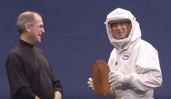 图注:2005 年,时任英特尔CEO Paul Otellini 将一枚英特尔生产的晶圆交给乔布斯,宣告两家公司合作的开始。