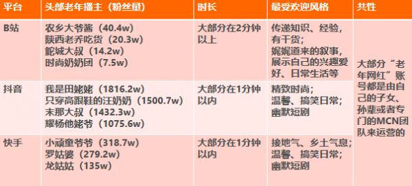 我对B站、抖音、快手三个平台部分头部中老年网红IP做了对比: