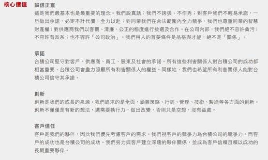 我们要承认台积电在商业领域的专业性,在台积电的财报里面,他们总是会在开头强调台积电的核心价值:“诚信正直,承诺,创新,客户信任”。