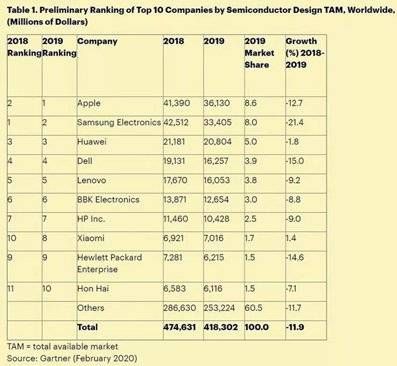 我们可以从全球十大芯片购买企业的金额来看,下图来自Gartner,体现的是2019年全球购买半导体金额最多的10家公司,其中华为全球第三购买了208.04亿美元的芯片,其中海思自研的芯片大约50%,可以从华为给台积电的采购订单看出来,台积电2019年的营收中来自海思的占了14%,而当年台积电的营收为357.74亿美元,这意味着差不多50亿美元的代工订单来自华为。