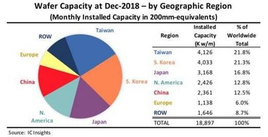 下图是按照IC insight的数据,2018年底全球晶圆产能的分布,中国台湾世界第一,而韩国是世界第二,日本世界第三,美国世界第四,中国世界第五。