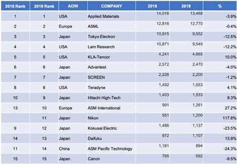 我们可以看下美国的半导体行业调查公司VLSI Research在2020年3月发布的2019年全球半导体设备厂商的销售额排名(速报值):