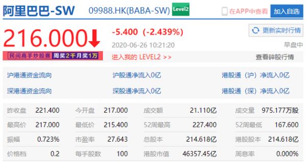 新浪科技讯 6月26日上午消息,阿里巴巴现价下跌2.439%,报216元。