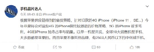 爆料KOL@手机晶片达人6月25日在微博爆料表示,针对旧款的4G iPhone,例如iPhone11、新iPhoneSE,苹果在今年将采用激进的定价策略。