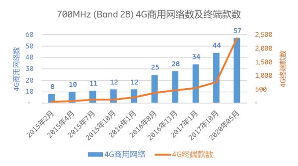 吴日平介绍,700MHz用于移动通信最早始于2014年。那一年,基于700MHz的4G网络建设成功拓展了这一“黄金频段”的应用领域。据GSA统计,截至2020年5月,全球已经商用了57张B28 700MHz的4G网络,终端款数达到2375款,700MHz也成为继FDD1800MHz、FDD800MHz、FDD850MHz、FDD2.6GHz之后,全球4G商用网络数第五多的4G频段。全球700MHz 4G商用网络数及终端款数如图所示。