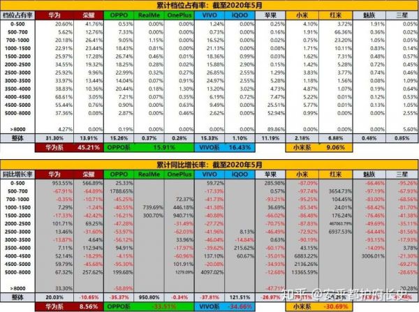 vivo系(包含vivo和iQOO两个品牌)2020年5月占有率16.5%,同比增长-18.8%;累计占有率16.4%,累计同比增长-34.7%;