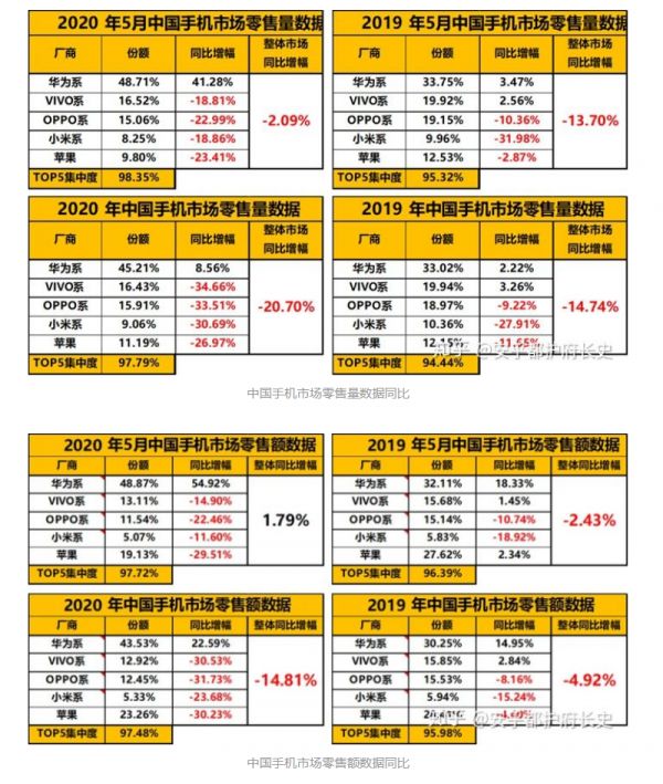 苹果的2020年5月占有率9.8%,同比增长-23.4%;累计占有率11.2%,累计同比增长-27.0%;