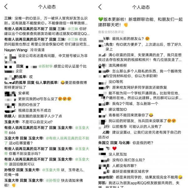 “朋友”App官方发现了这个问题,于是取消了ID账号的显示,虽然打击了“养号人”,但也带来了诸多不便,比如用户无法通过ID加好友。因此,大量用户在官方动态下留言评论,表达对ID重新显示的诉求。
