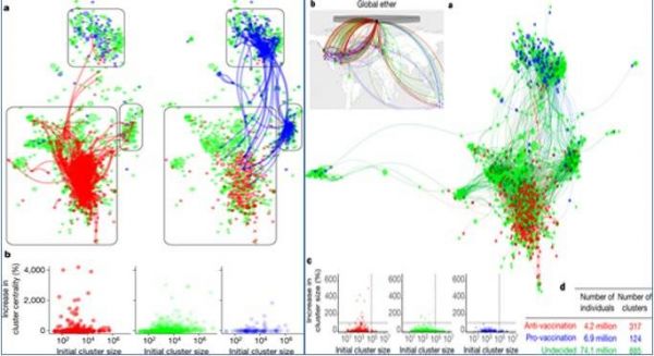 一项5月13日发表于《自然》上的研究追踪了2019年麻疹疫情爆发时期,脸书上近一亿用户对疫苗接种的舆情讨论。乔治华盛顿大学的尼尔·约翰逊(Neil Johnson)等人将讨论疫苗主题的脸书页面分成了反对、支持,以及对疫苗接种的态度不确定的三类,并分析了它们的发展、社群互动和传播策略。