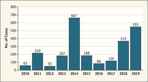 截至2019年4月的美国麻疹病例统计—Paules C I, Marston H D, Fauci A S. Measles in 2019—going backward[J]. New England Journal of Medicine, 2019, 380(23): 2185-2187