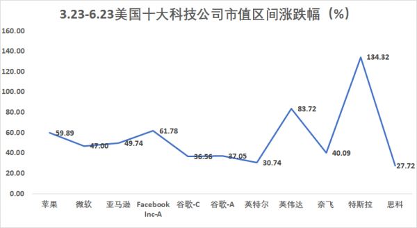 《深网》统计了美国总市值排名前十的科技公司近3个月来市值变化和区间涨幅发现,3月23日-6月23日之间,这十大科技公司市值区间涨幅都在20%以上,其中特斯拉涨幅最大,为134.32%,其总市值从3月23日的797.84亿美元涨到6月23日的1858.06亿美元;思科区间涨幅最小,为27.72%,总市值从3月23日的1467.34亿美元涨到6月23日的1919.88亿美元。