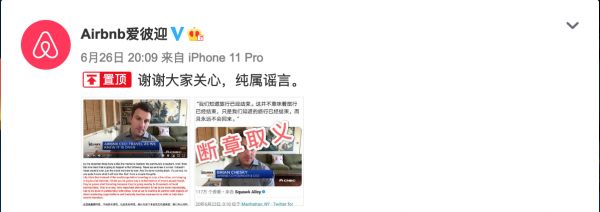 近日,关于美国共享住宿平台Airbnb爱彼迎即将破产的消息甚嚣尘上。6月26日晚间,Airbnb爱彼迎在其官方微博号发布置顶消息称:“谢谢大家关心,纯属谣言。”
