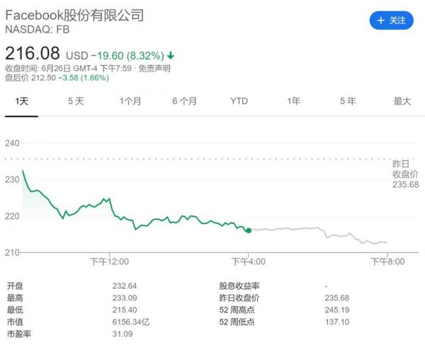 截至发稿,该消息传出后,Facebook的股价已下跌已超过8%。