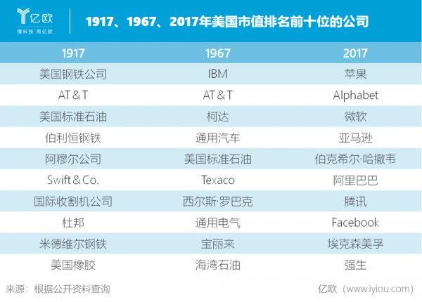 100年间,美国市值排名前十的公司也改天换地。亚马逊、谷歌、阿里巴巴、腾讯等互联网公司取代AT&T、通用电气、通用汽车等工业巨头,成为当下市值最高的公司。