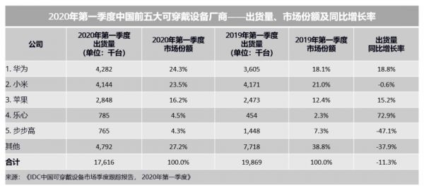 根据网上公开资料显示,2020年第一季度中国前五大可穿戴设备厂商的出货量与市场份额统计数据中。除苹果外,华为与小米两家在2020年第一季度已占据47.8%的总份额,同比增长22%。中国智能穿戴设备市场,已经逐渐进入少数厂商垄断的局面。