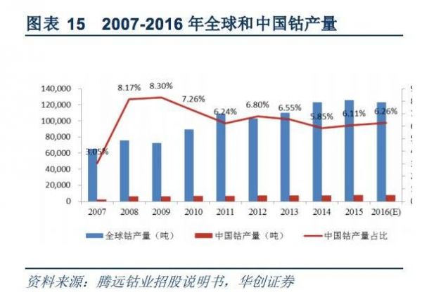2007-2016年全球和中国钴产量(来源:华创证券)