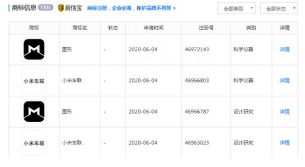 6月28日消息,启信宝数据显示,小米集团(1808.HK)已于2020年6月申请注册小米车联商标,同日还申请注册相关图形商标,两者国际分类皆为9类科学仪器、42类设计研究。
