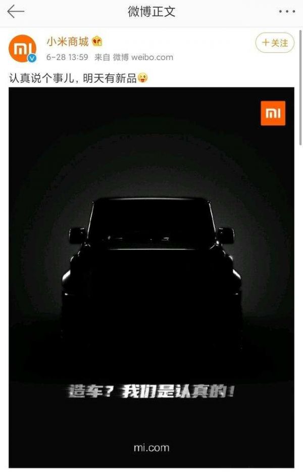 与此事件一同发酵的是,6月28日,小米商城官方微博发布一张海报,海报中间有一个明显的汽车轮廓,并配文“认真说个事儿,明天有新品”。海报上的文案则是“造车?我们是认真的!”。