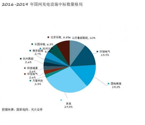 国家电网是国内最大的充电桩公开招标企业,也是最早入行的建设运营方。近4年来国网每年进行三批次的充电桩招标,统计下来中标数量前三的是国电南瑞、许继电气和山东鲁能,清一色国网嫡系。