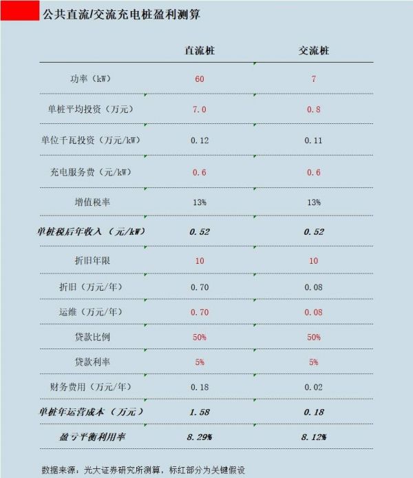 光大证券专门做了个分析模型,测算了60kW的直流快充桩的回报周期,以6万元的单桩成本来测算,根据各地的指导价取0.6 元/kW的充电服务费。