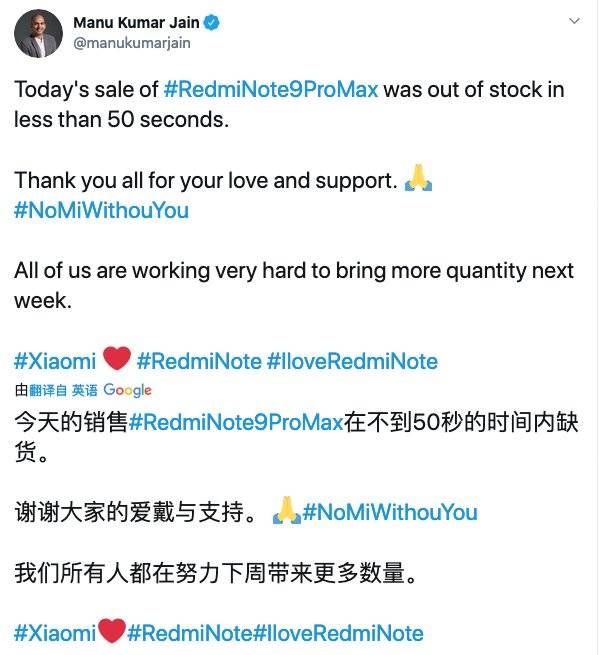 在6月24日的一条推文中,Jain说道,小米的红米Note9 Pro Max在销售过程中不到50秒就断货了。他表示,反华情绪主要限于社交媒体,并没有影响到其在印度的业务。